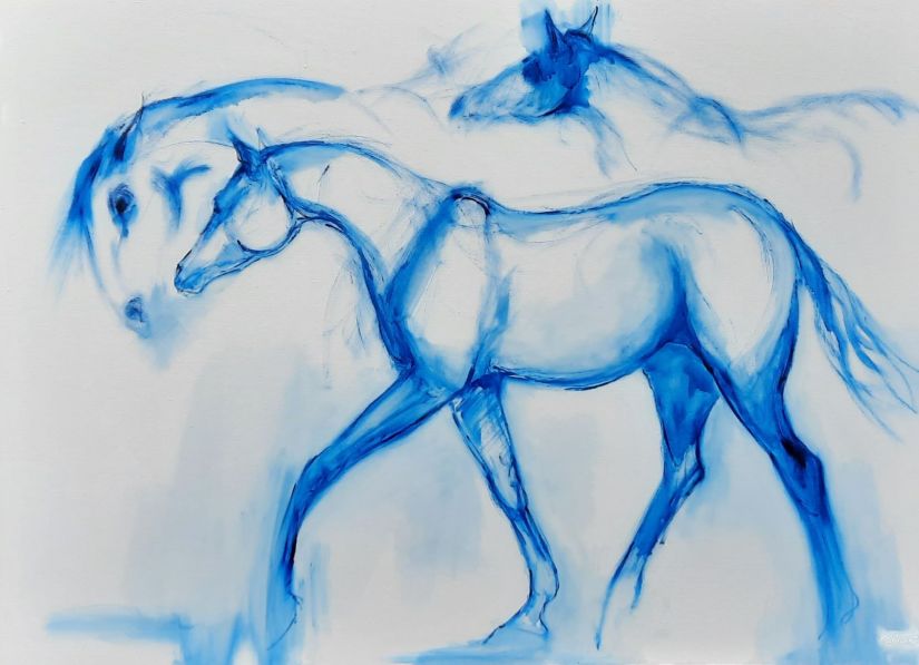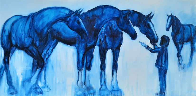 “Two Horses, Two children In Blue”, oil on canvas, 1010x1520mm sold