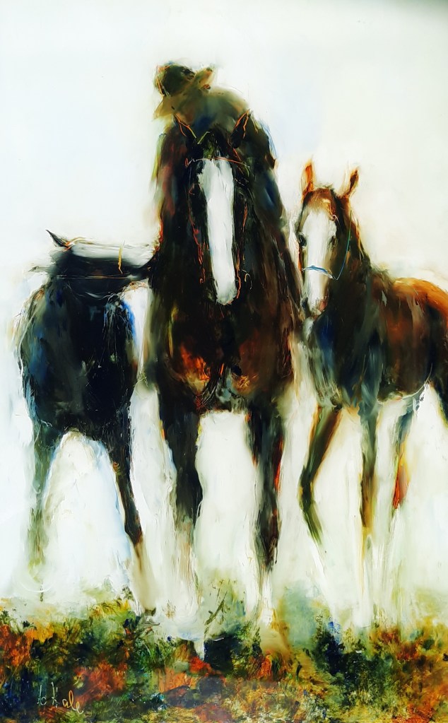 sold New Horizons , Woman with Packhorse, oil on Glass 470x298mm $720