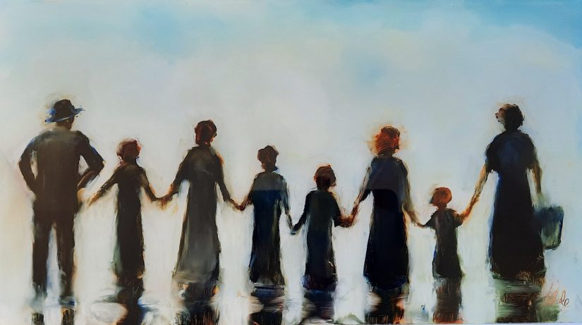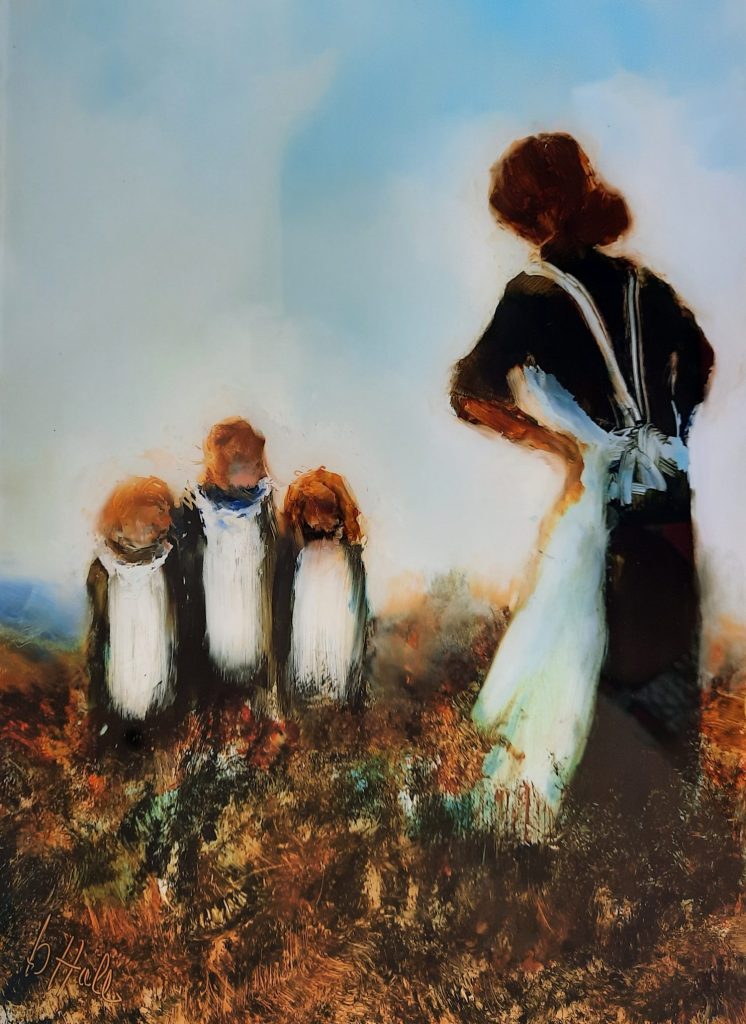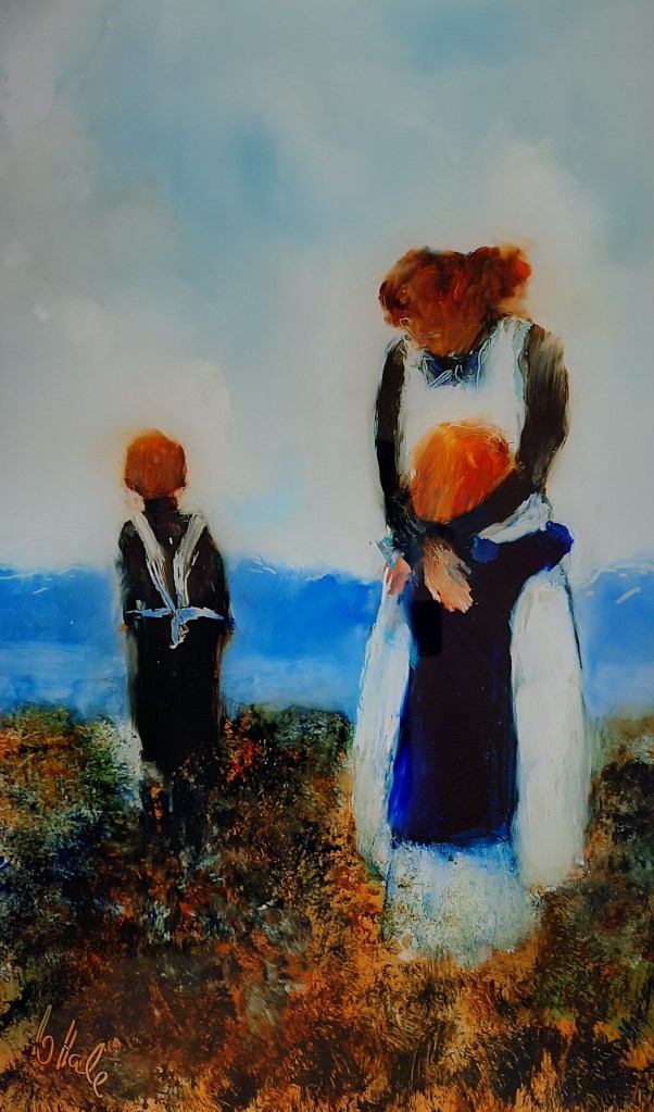 Family of Girls Oil on Glass 298x160mm $450 Image may show some reflection.Trouble Brewing , oil on Glass 220x153mm $370